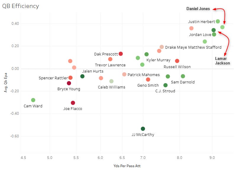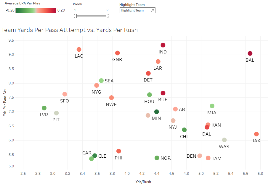 We have just a two-game sample on every team. It’s early, and things will change. But here’s our first look at the offensive efficiency plot. This plots yards per pass attempt against yards per rush, and colors the dots by average expected points added per play.
