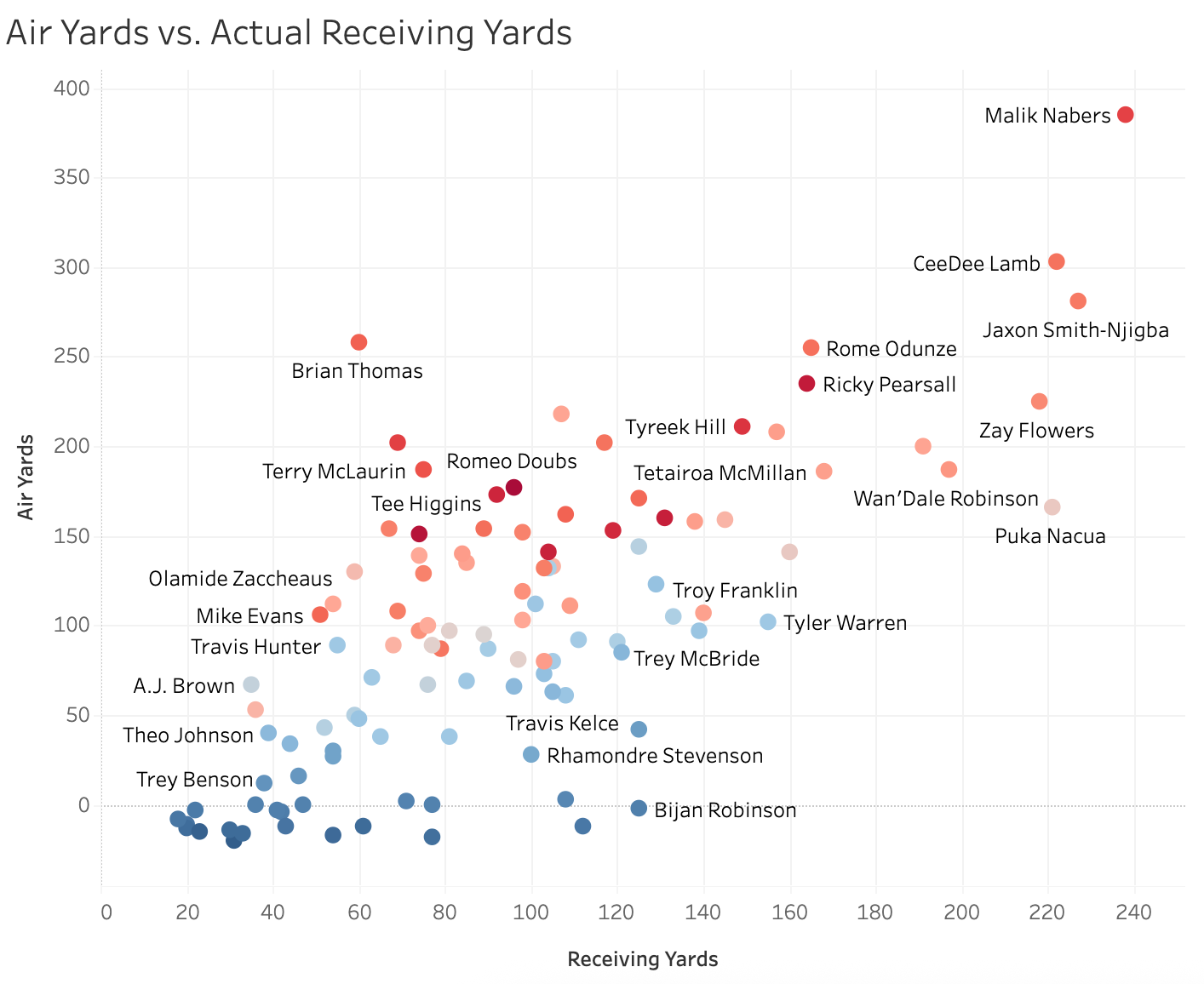 I like checking the Air vs Actual Yards plot every week. This gives you an idea of which guys are getting a ton of opportunity and which are converting on it.