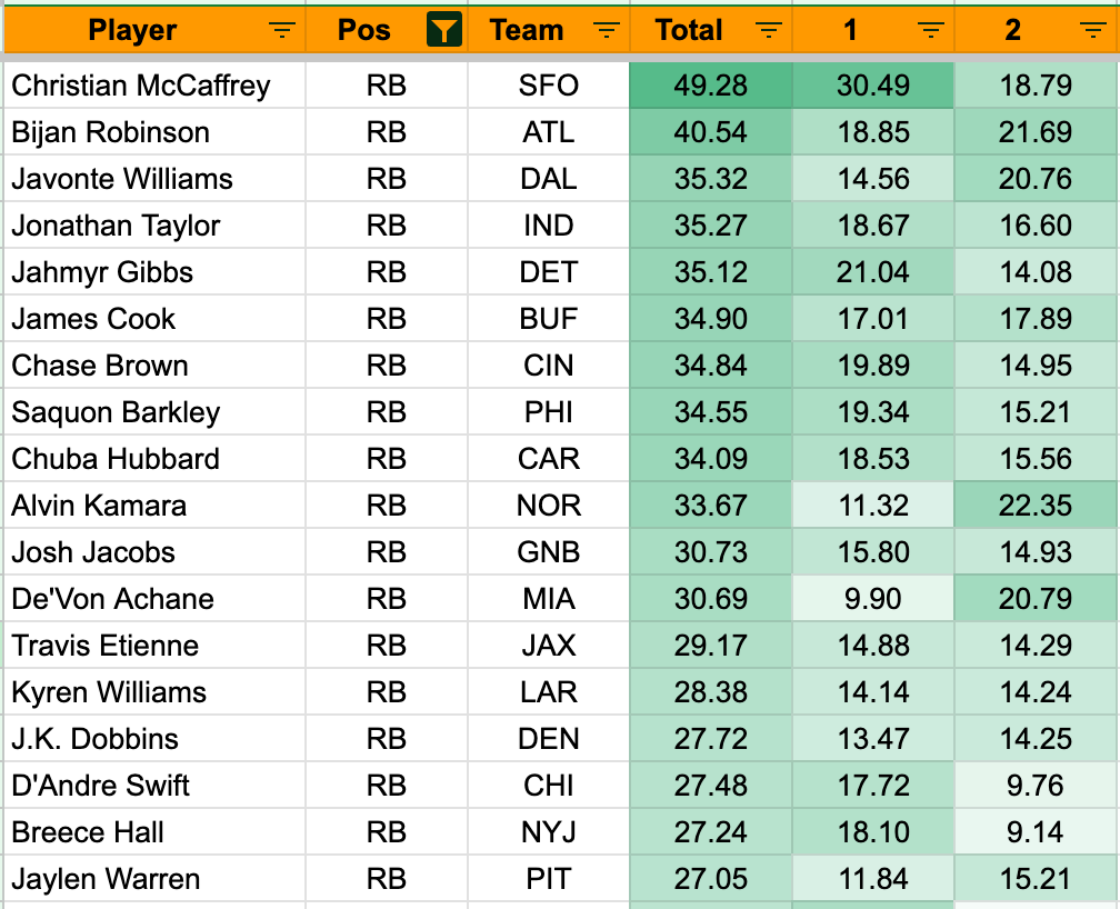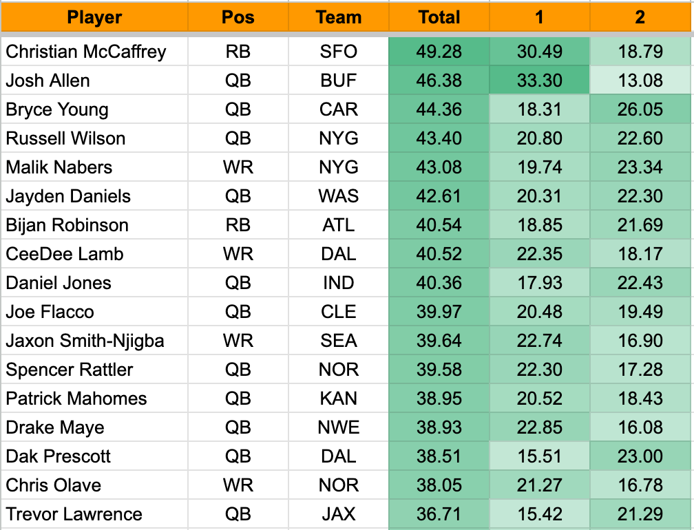 On the other side are, predictably, young QBs just getting their feet wet. Not a good start from Cam Ward nor JJ McCarthy, and we see Bryce Young continuing to struggle early on. Patience is required with rookie QBs. Being a rookie QB might be the toughest situation in professional sports. I find it best to just avoid those offenses entirely (except for in the case where I drafted Tony Pollard in my home league…).