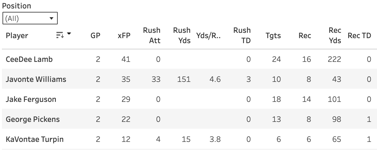 There was this groupthink among the experts that Javonte would quickly lose the job in Dallas. He was just too bad a player to keep it! But so far, Javonte has 33 of the 42 RB carries and has averaged 4.6 yards per tote. He’s added ten targets and a nice 8-43 line in two games. That puts him #3 on the RB xFP leaderboard.
