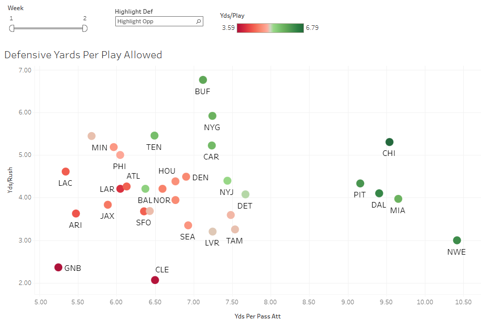 It’s flipped in this situation. The upper-right teams have been bad defensively, and vice-versa. So the Packers are looking like a stud defense to avoid with fantasy players early on. Those are impressive marks, even through just two games.