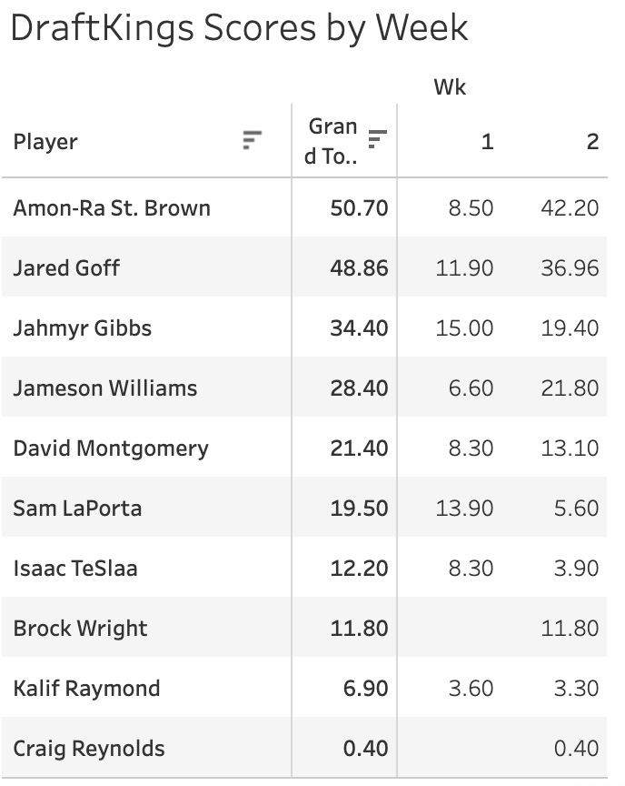 After averaging 3.7 yards per play in week one, they went for 8.7 in week two. Amon-Ra St. Brown was the player of the week with a 9-115-3 line. They scored all those points with a -8% PROE%, but still neither David Montgomery nor Jahmyr Gibbs exceeded 12 carries. They both had fine games, but the huge games went through the air to the receivers.