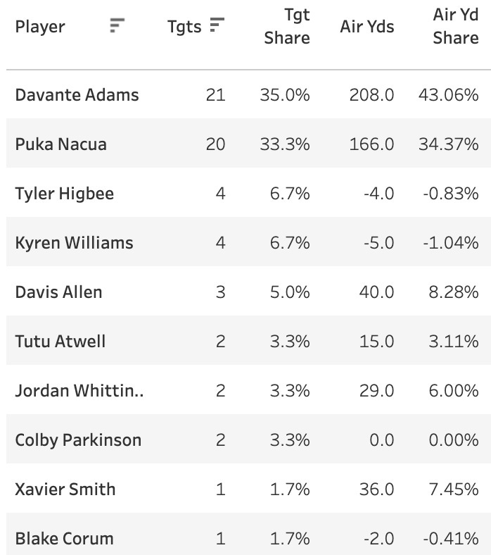 This is about as concentrated as you’ll find a passing game. Davante Adams and Puka Nacua both went off here. Adams led with 13 targets and a 6-106-1 line, while Nacua went 8-91-0 through the air and added a 45-yard rushing touchdown.